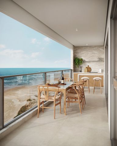 Sacada frente mar com churrasqueira a carvão e guarda-corpo em vidro