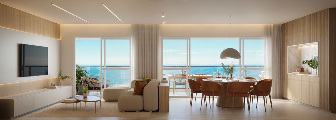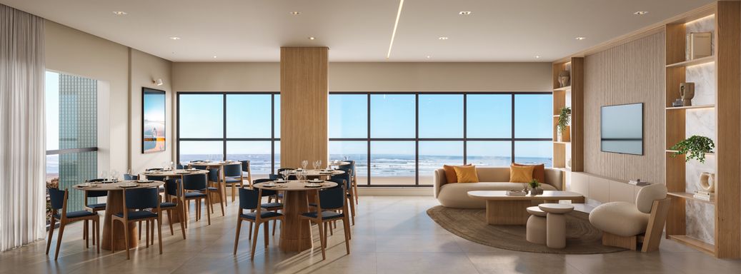A cada ambiente, o Villamare revela o equilíbrio entre sofisticação e leveza — do hall de entrada ao terraço com vista infinita para o mar.
