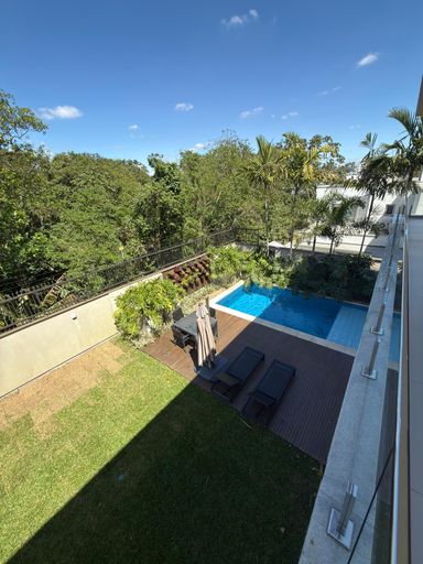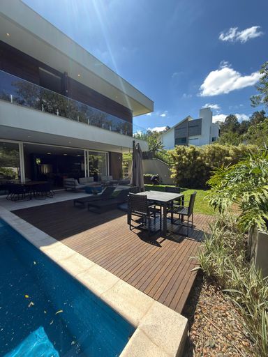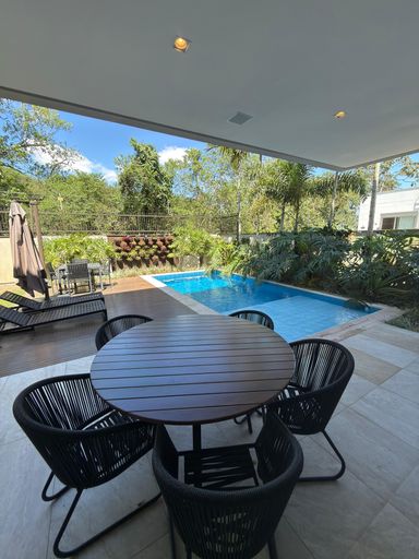 O espaço gourmet, equipado com fogão industrial, integra-se ao jardim com irrigação automatizada, criando o cenário perfeito para encontros memoráveis. A piscina com jato de hidromassagem garante momentos de relaxamento.